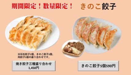 きのこ餃子5個590円、焼き餃子三種盛り合わせ1450円
