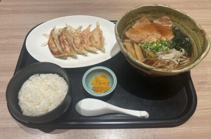 昔ながらの懐かしくも、ふと食べたくなる醬油ベースの中華そばと野菜のうま味たっぷりの石松餃子のセットで、ラーメンはなんとハーフではなく単品メニューとそのまま同じサイズでのご提供です。